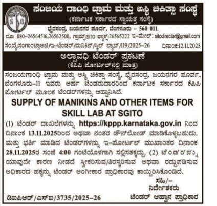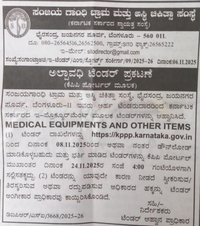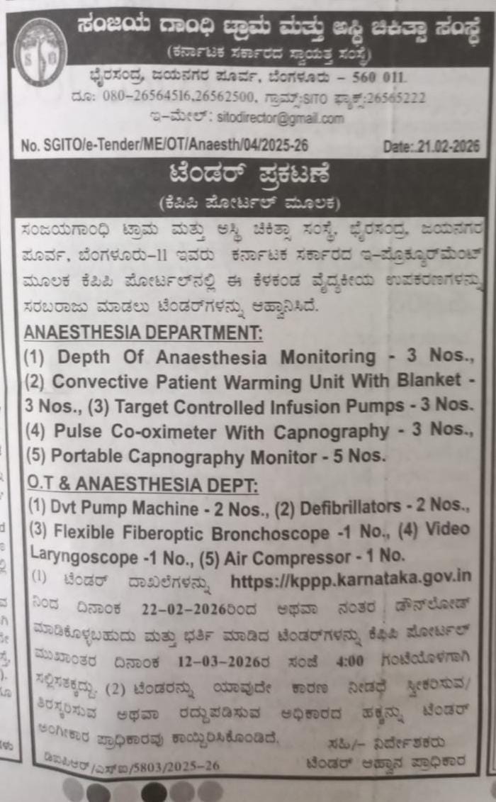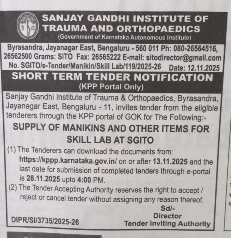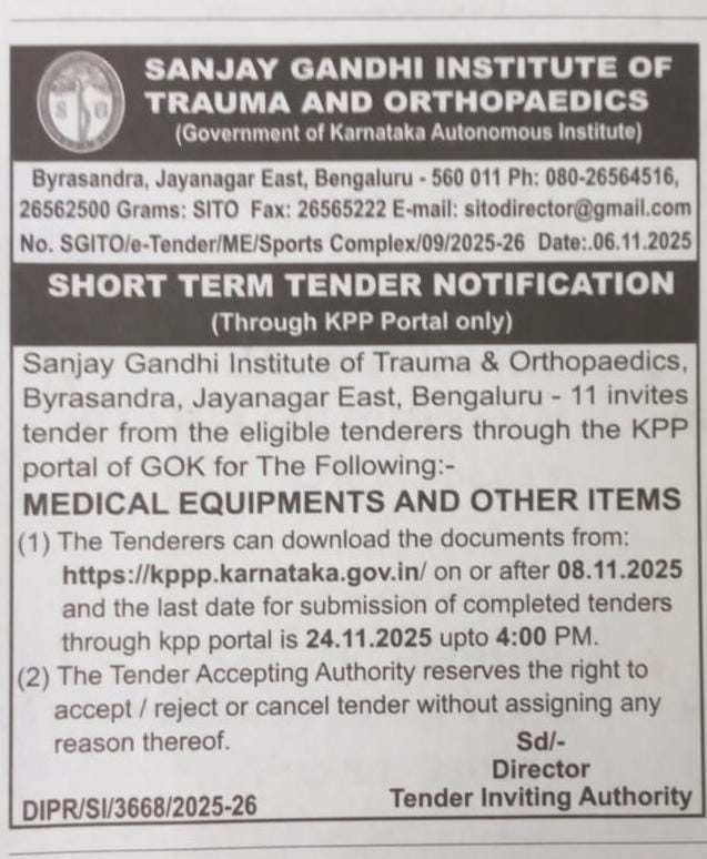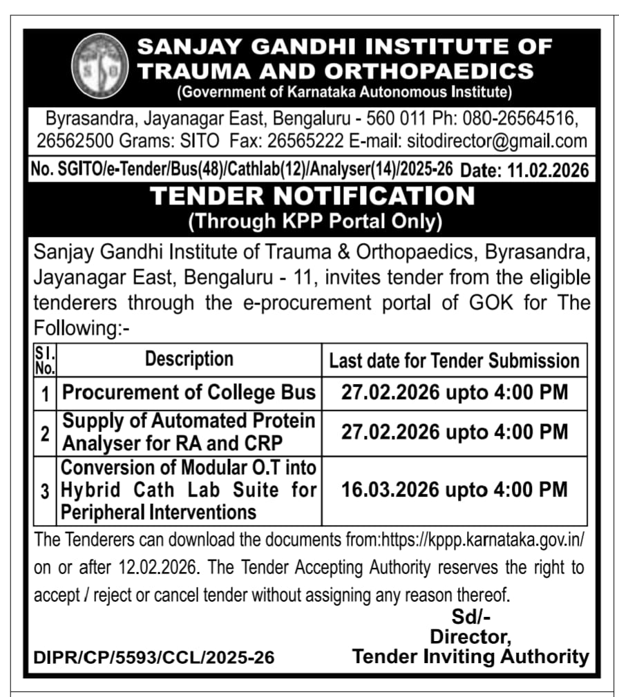 Sanjay Gandhi Institute of Trauma & Orthopaedics, Bangalore has initiated E-Procurement Platform on the E-Procurement Portal of the Government of Karnataka. E-Tenders are accessible on the following website: http://www.eproc.karnataka.gov.in