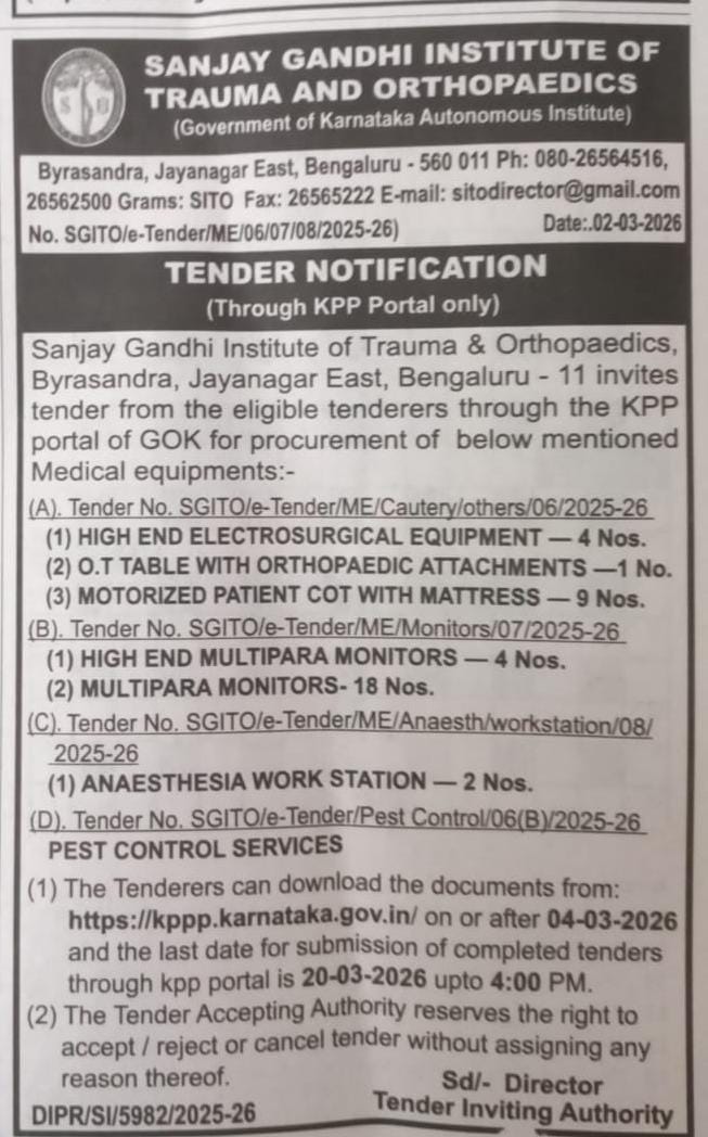 Sanjay Gandhi Institute of Trauma & Orthopaedics, Bangalore has initiated E-Procurement Platform on the E-Procurement Portal of the Government of Karnataka.
